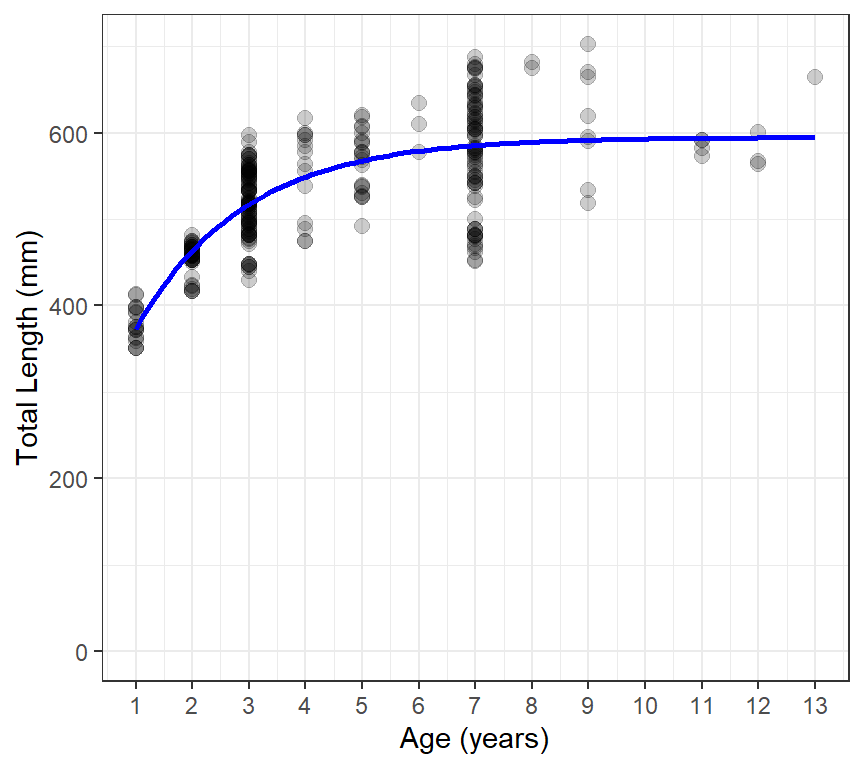 #> 595.0451068 0.5233219 -0.8861433As mentioned previously, growth modeling in general, but also in R, can be much more involved then what is shown here. We recommend the “Growth Estimation” chapter of this book as a comprehensive resource for modeling fish growth in R. However, this demonstration from FSA and several fishR posts are also good resources for using R to model growth.