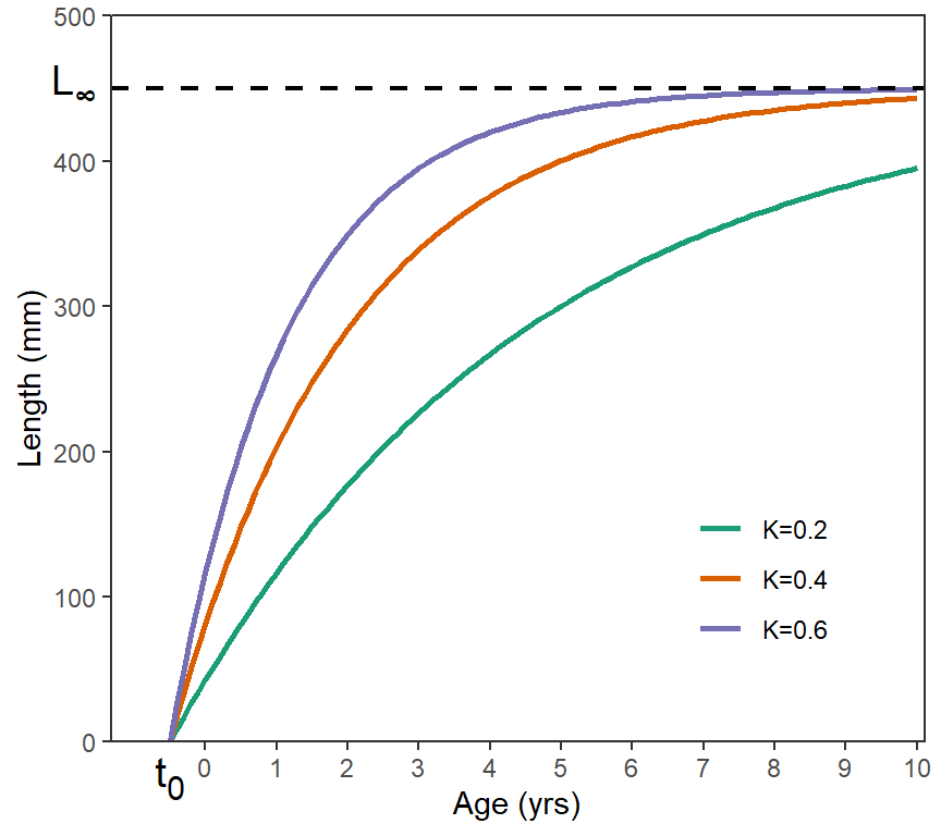There are several aspects of the VBGF that are often confused. First, the VBGF, as with most growth models, represents the average length at a given age. In other words, individual fish would be points that would be scattered around one of the VBGF lines shown in Figure 1. One ramification of this is that is the asymptote for the mean length, not individual lengths. Thus, is not an esimate of the maximum length of individual fish but, rather, an estimate of the maximum mean length of fish in the population. Second, , is the so-called “Brody growth coefficient” but it does not represent growth in a true sense of the word. The units of are the inverse of time (e.g., years-1) rather than units of length divided by units of time. does represent how fast the mean length-at-age approaches , with approached more quickly for larger values of (Figure 1). So, represents the rate of growth but it is not an actual measure of any specific type of growth rate. Third, is the x-intercept of the VBGF and a modeling artifact that is required to “anchor” the left side of the VBGF so that the VBGF best represents the available data (which is often not extensive for young fish). One should not try to interpret a biological meaning for . Fourth, all three parameters of the VBGF are highly correlated, which means that several combinations of , , and may produce very similar VBGF trajectories.3