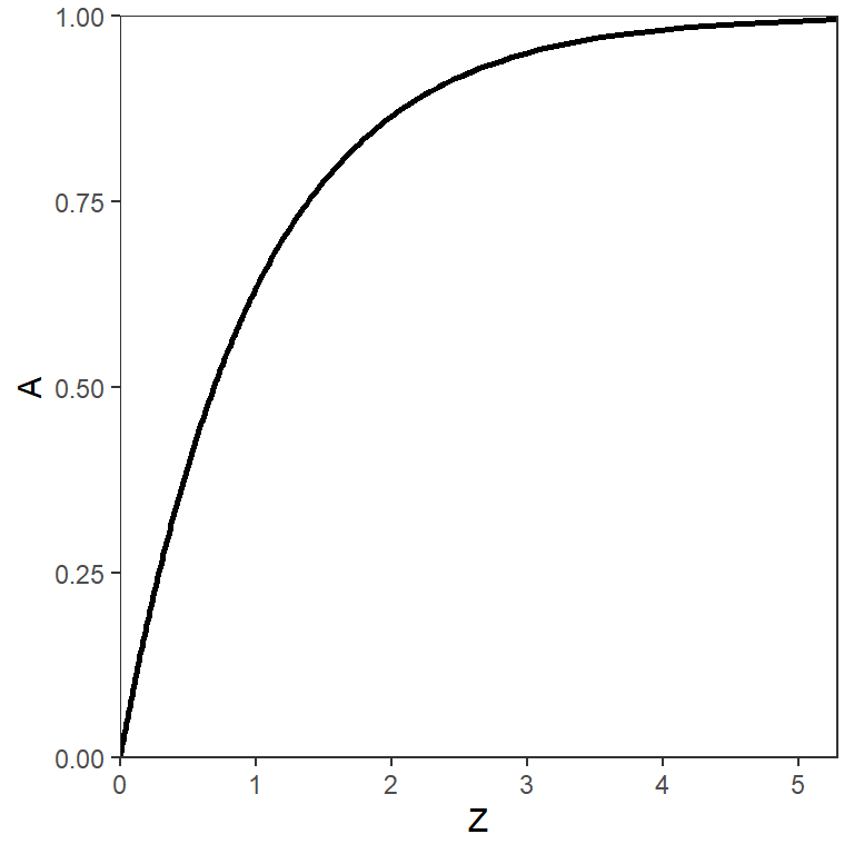 as can be seen by comparing Equation 3 and Equation 4 and then simplifying. The relationship between and is logarithmic (Figure 3). Further note that is between 0 and 1 (i.e., it is a proportion), whereas is only positive (i.e., between 0 and ).
