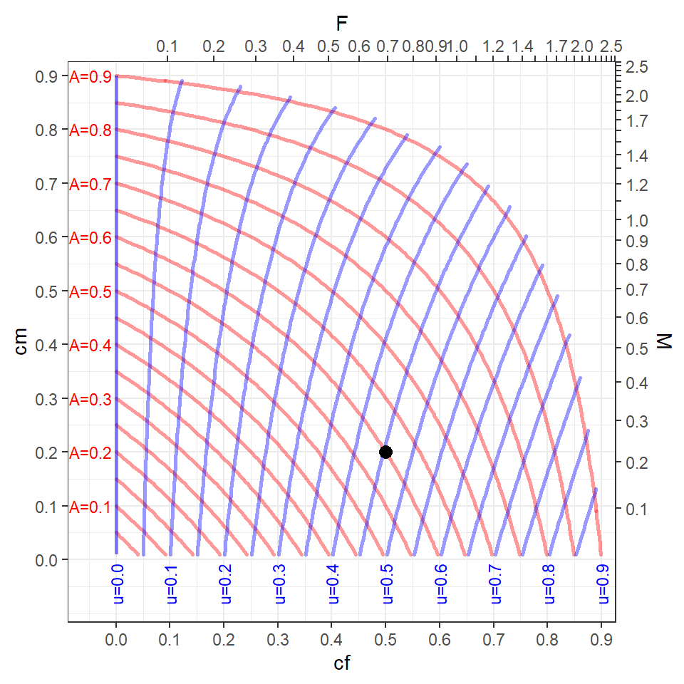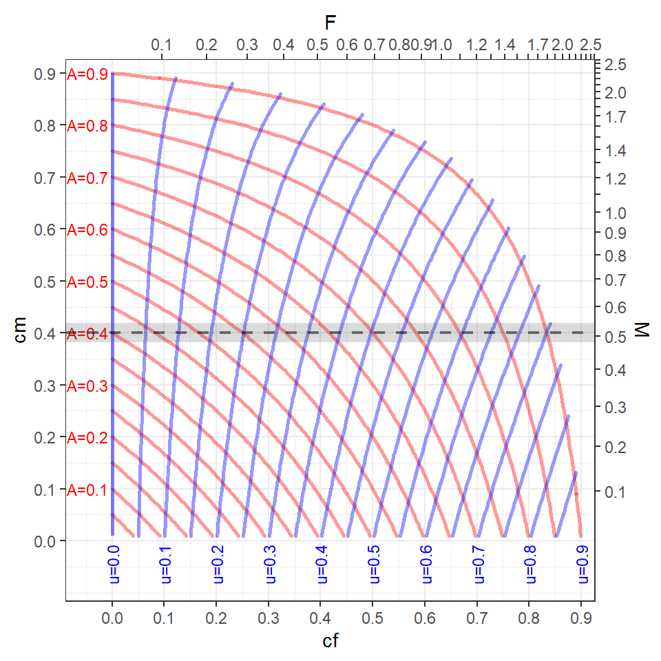 cf=0.5 andcm=0.2, then is approximately 0.6 (which can be confirmed with 0.5+0.2-0.5x0.2 from Equation 6).7 - The curving blue lines are “contours” of equal values of , which are labelled at the bottom of every-other contour. For example, if