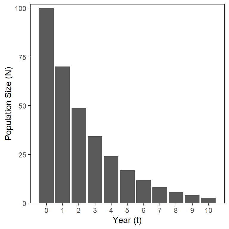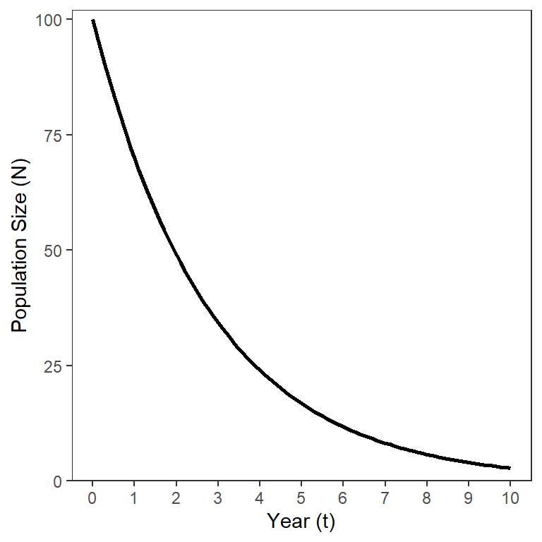 The model in Equation 3 shows that the number in a cohort (i.e., same group) that starts with individuals will decline exponentially over time (Figure 1).
