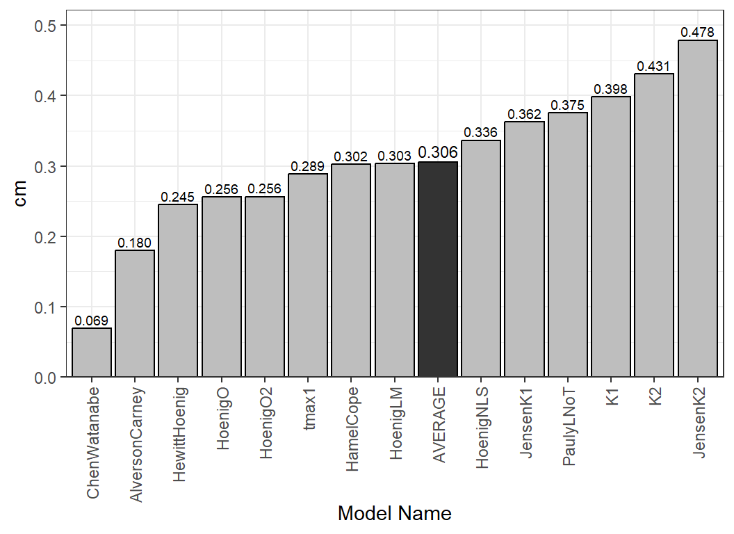 #> 14 ChenWatanabe 0.07181977 0.06930138 tmax=15, K=0.3, t0=-0.5Users of rFAMS will most often use these estimates to get an idea of cm values to use in the YPR and DP modeling. This may be aided by including the average cm (and M) to the bottom of the output with incl.avg=TRUE.