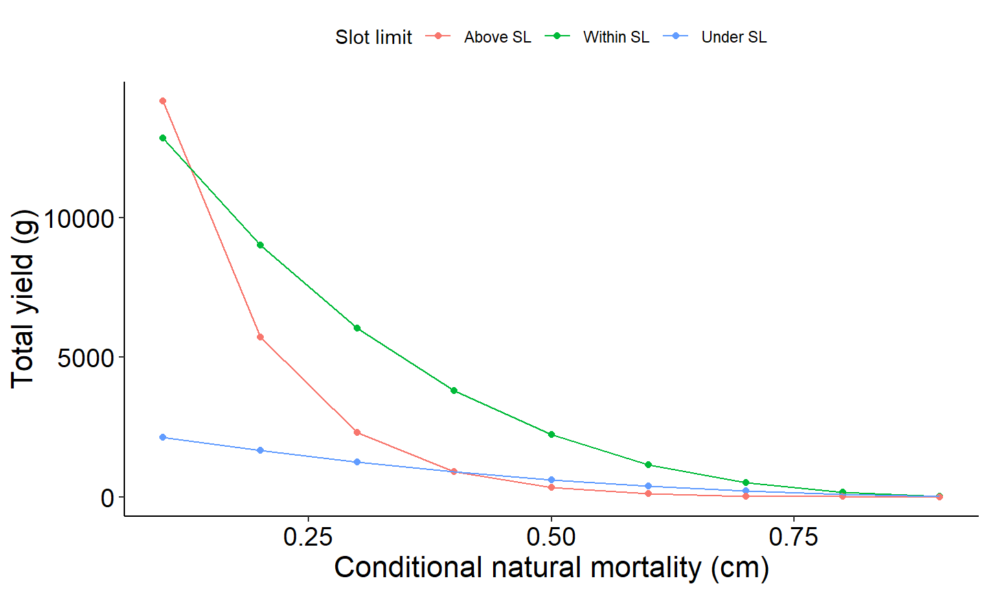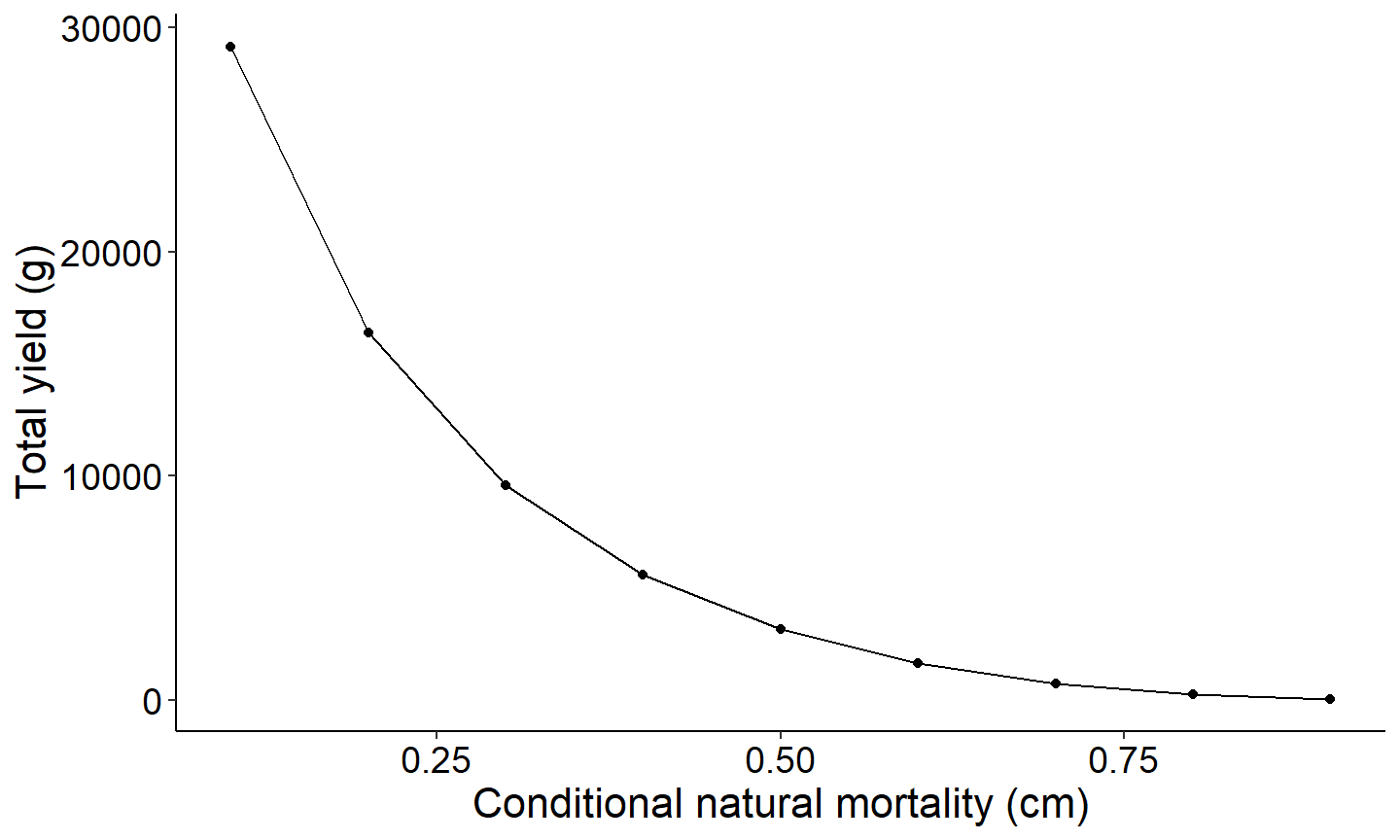 labs(y="Total yield (g)",x="Conditional natural mortality (cm)") +