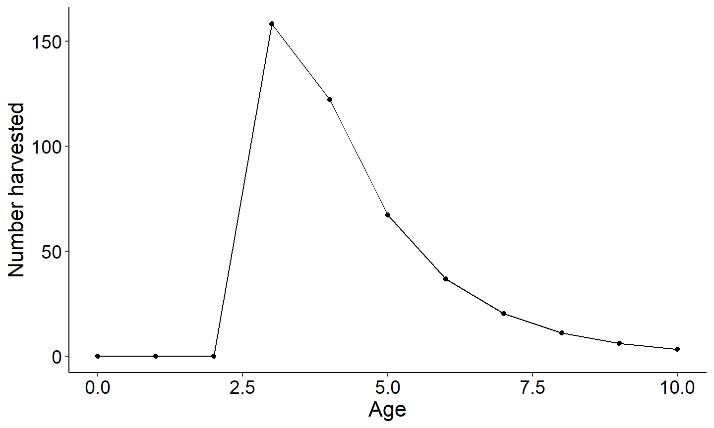 ggplot(data=plotdat,mapping=aes(x=age,y=nharvest)) +