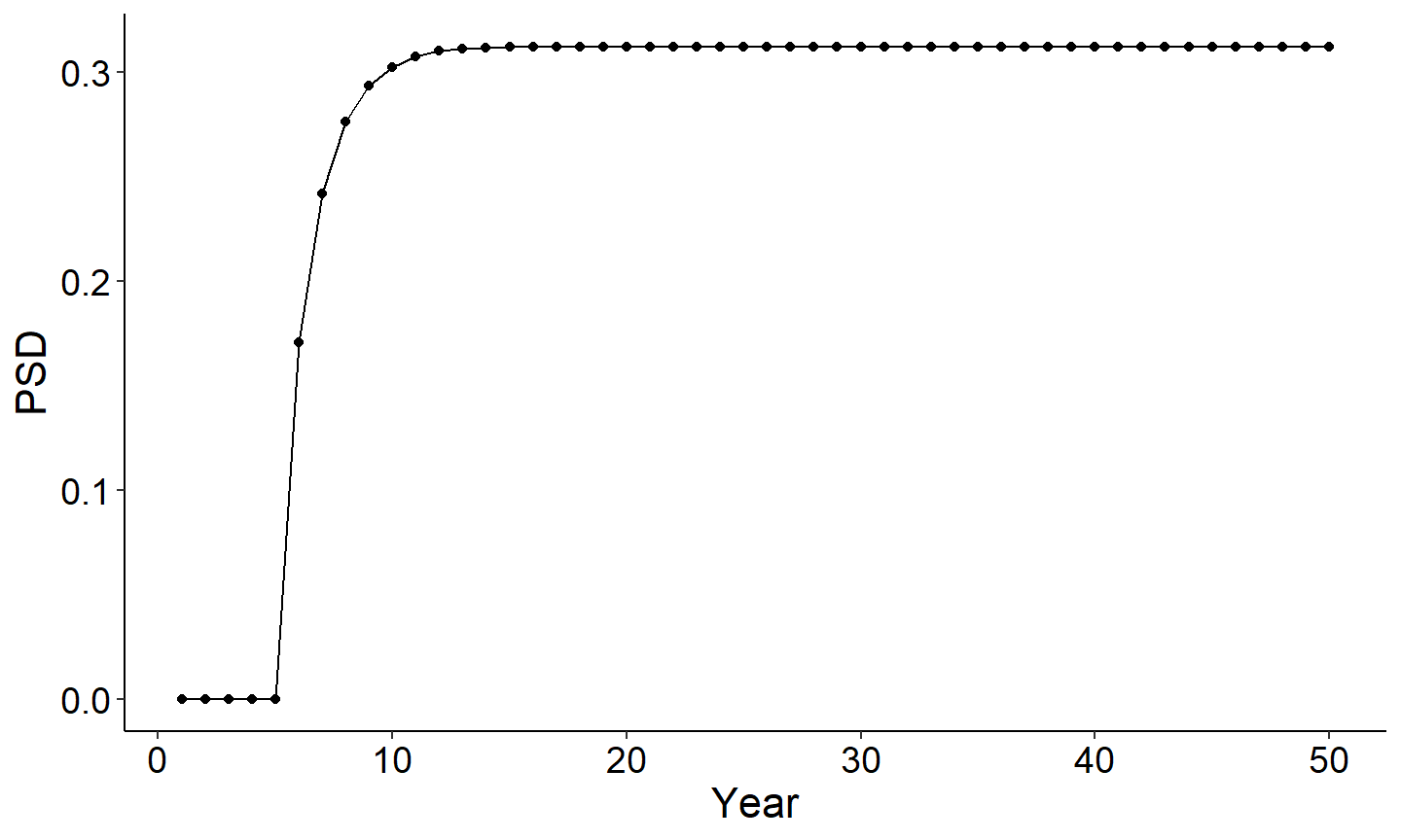 The next set of figures will explore the output summary by year. The first figure is PSD vs year and the second figure is Yield of age 1 plus vs year. Note each figure reaches an asymtote once all age classes are present in the population. This is because recruitment, cm, and cf are held constant across years.