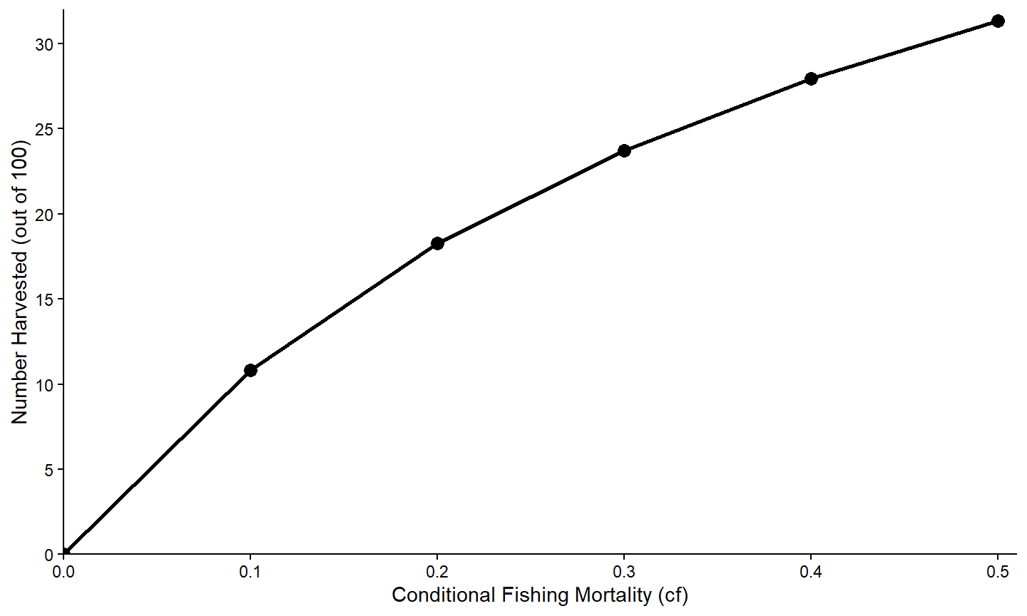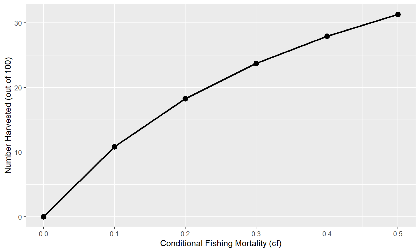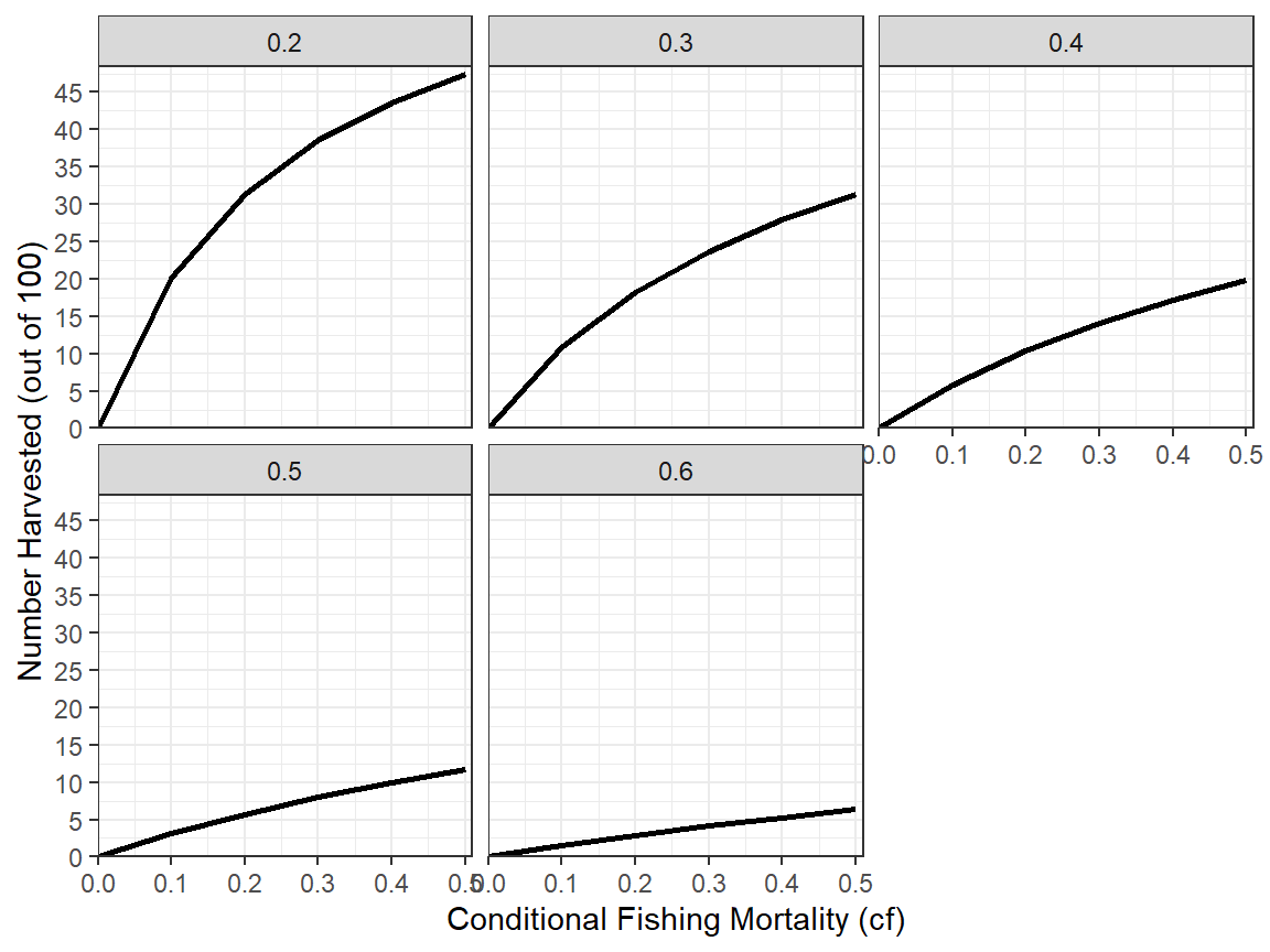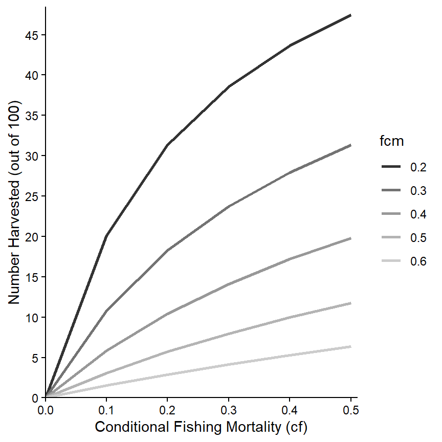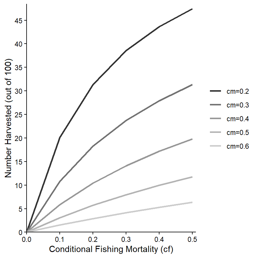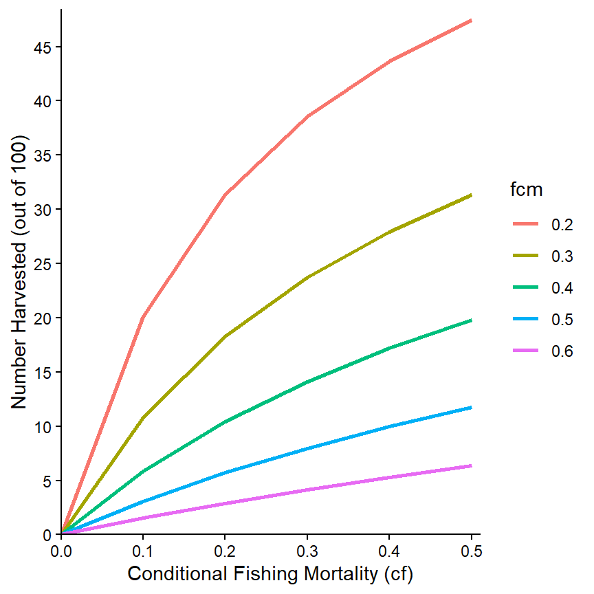 One question we may have with these data is how the number of fish harvested changes with conditional fishing mortality. This seems easy enough to plot cf on the x-axis and nharvest on the y-axis. However, nharvest is ultimately a function of both conditional fishing and conditional natural (i.e., cm) mortality and the cf values were repeated for different cm values. For example, the first 12 rows of the data.frame below, restricted to just nharvest, cf, and cm for clarity, show how cf ranges from 0.0 to 0.5 with cm=0.2, and then repeats for cm=0.3.
