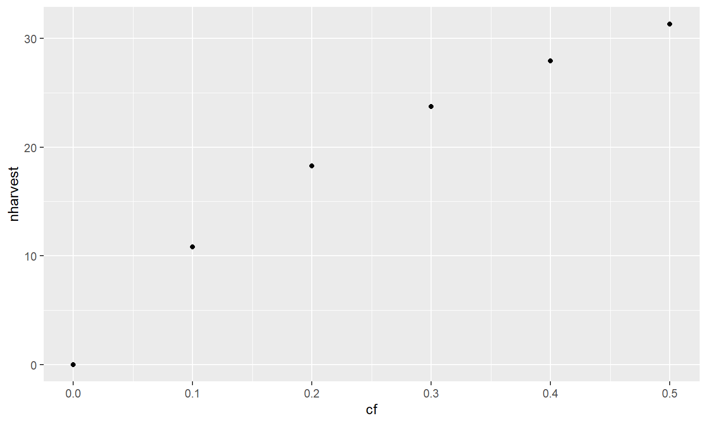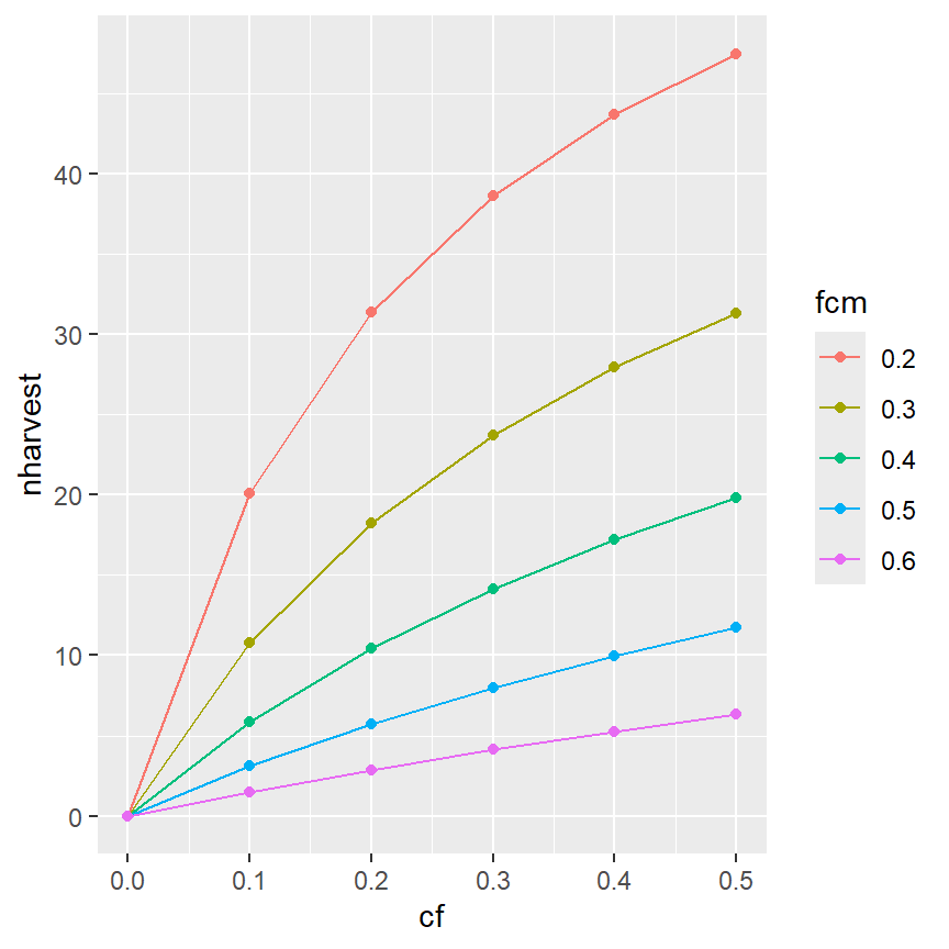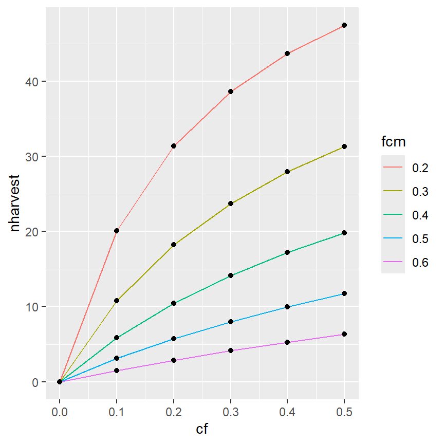 #> 12 0.5 0.3 31.32222Thus, it would be best to look at nharvest versus cf separately by values of cm. ggplot2 can efficiently create a plot of nharvest versus cf with separate lines based on cm;2 however, for this quick introduction to ggplot2 a simple data.frame restricted to just cm==0.30 will be used. We will return to the larger data.frame later.