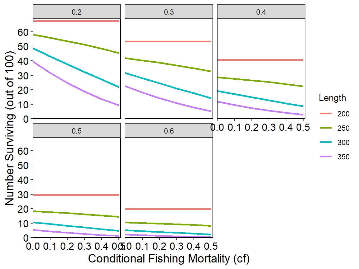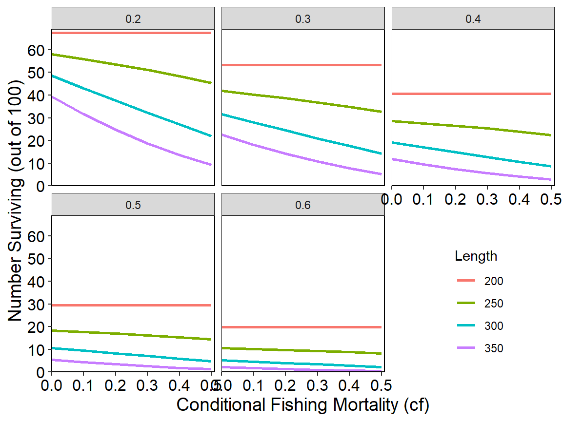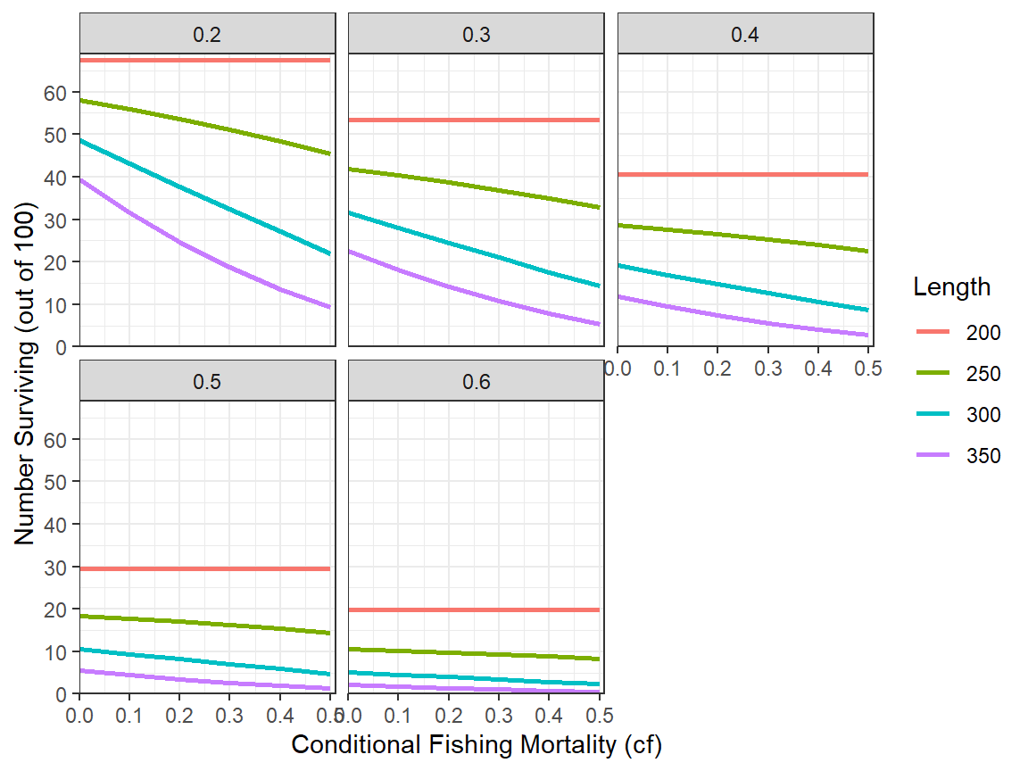It is also possible to use faceting to examine this relationship for the numbers of fish that survived to the other lengths. Make special note of the return to using the tmp2long data.frame here.