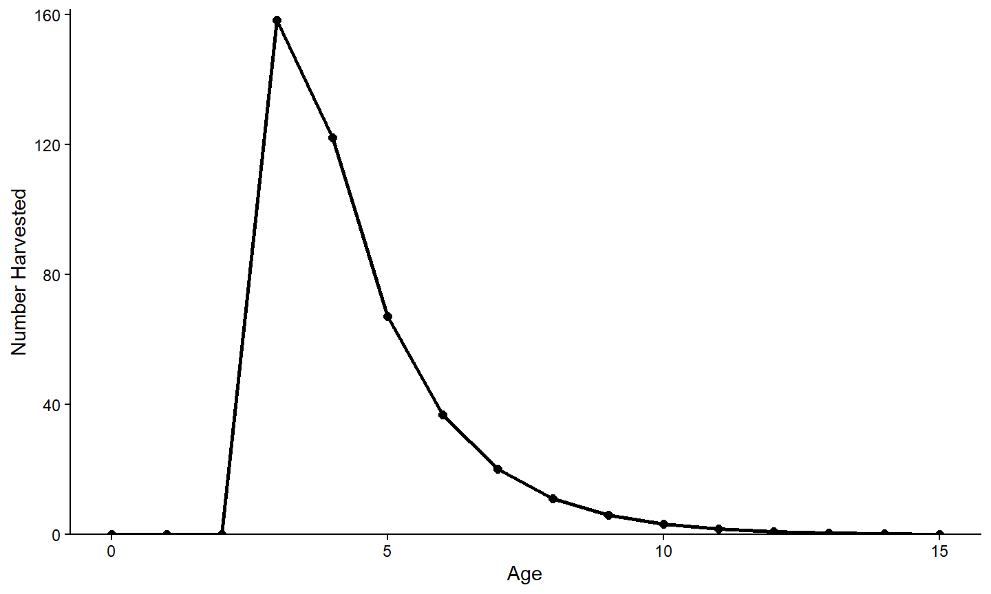 #> 6 245109.6 400 1000 1349.5 0.111 0.065 -5.2147 3.153 15Accessing this data.frame in this way means that it can be used just like any other data.frame. For example, the first year-class in this data.frame is isolated below and a graph of the number harvested by age is created.
