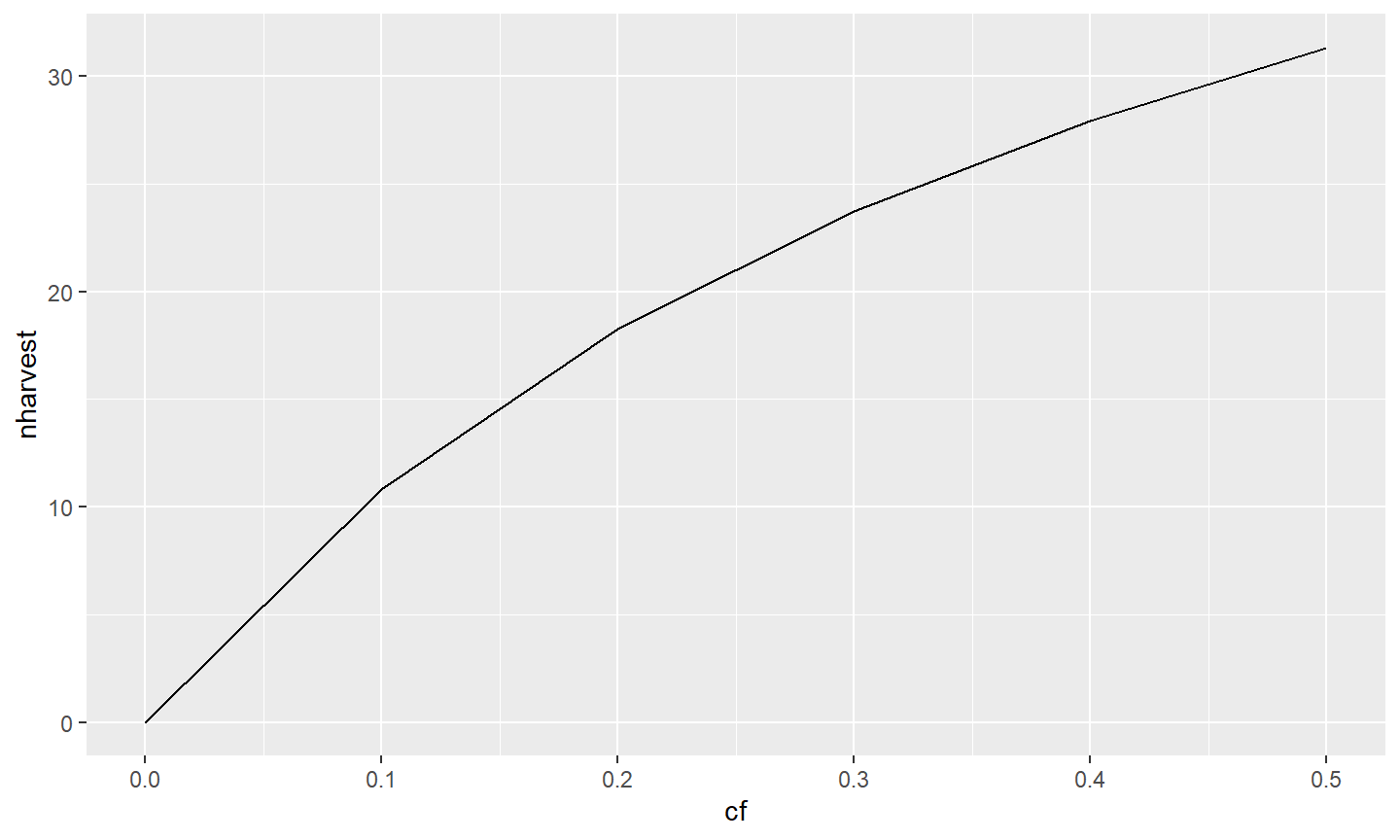 geom_line(data=tmp1,mapping=aes(x=cf,y=nharvest)) +