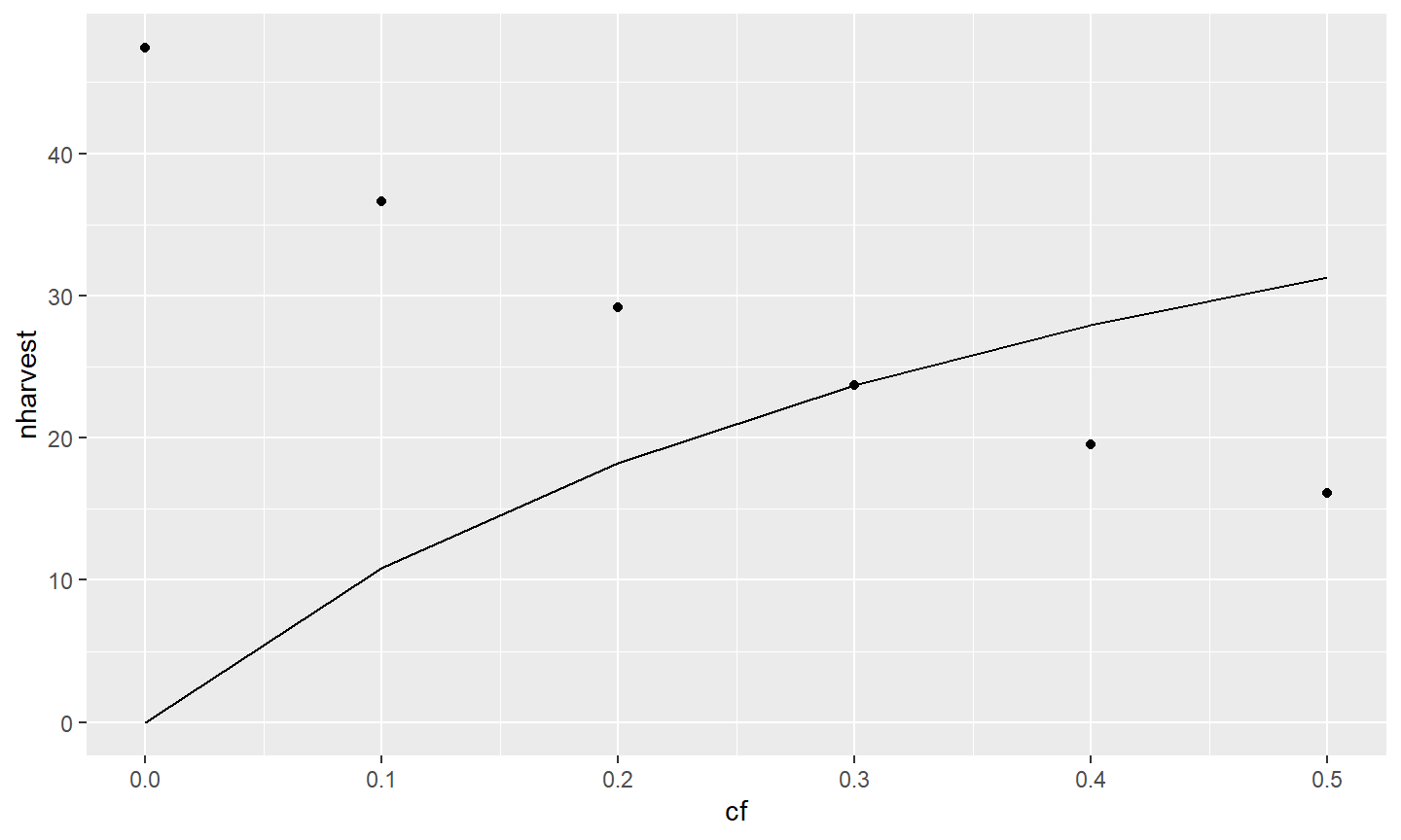 Let’s return to examining just nharvest against cf. As illustrated above, multiple layers (i.e., geom_s) may be used in one graph. Here the relationship is shown as a line and with points.