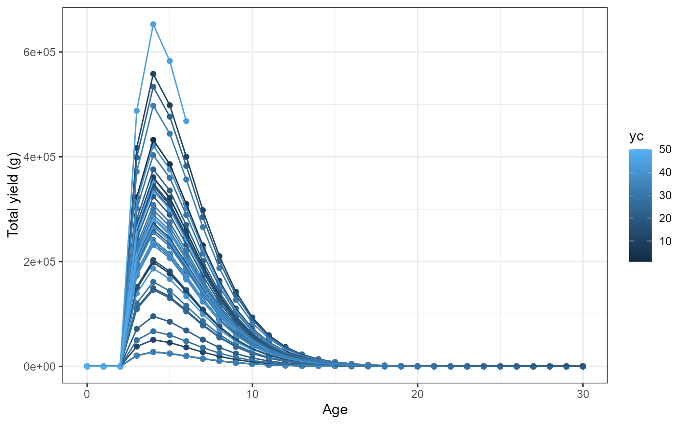 #Plot yield vs age for each year class