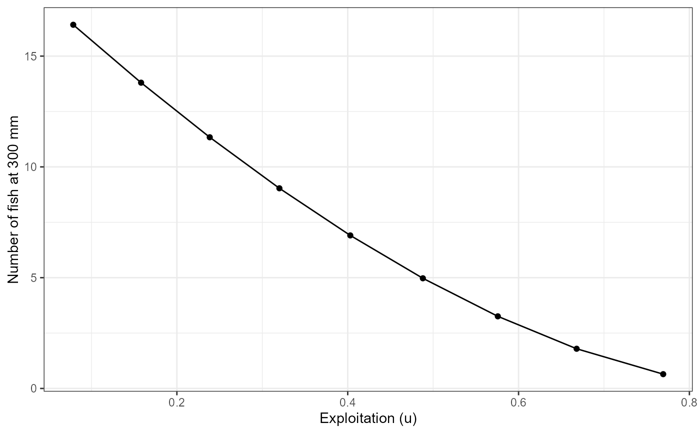 labs(y="Number of fish at 300 mm",x="Exploitation (u)") +